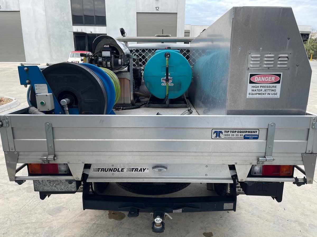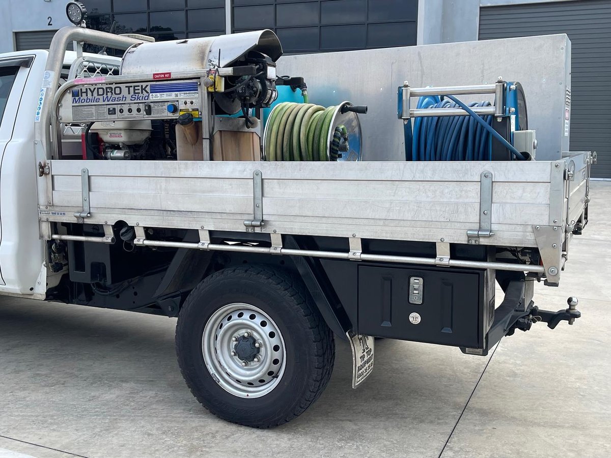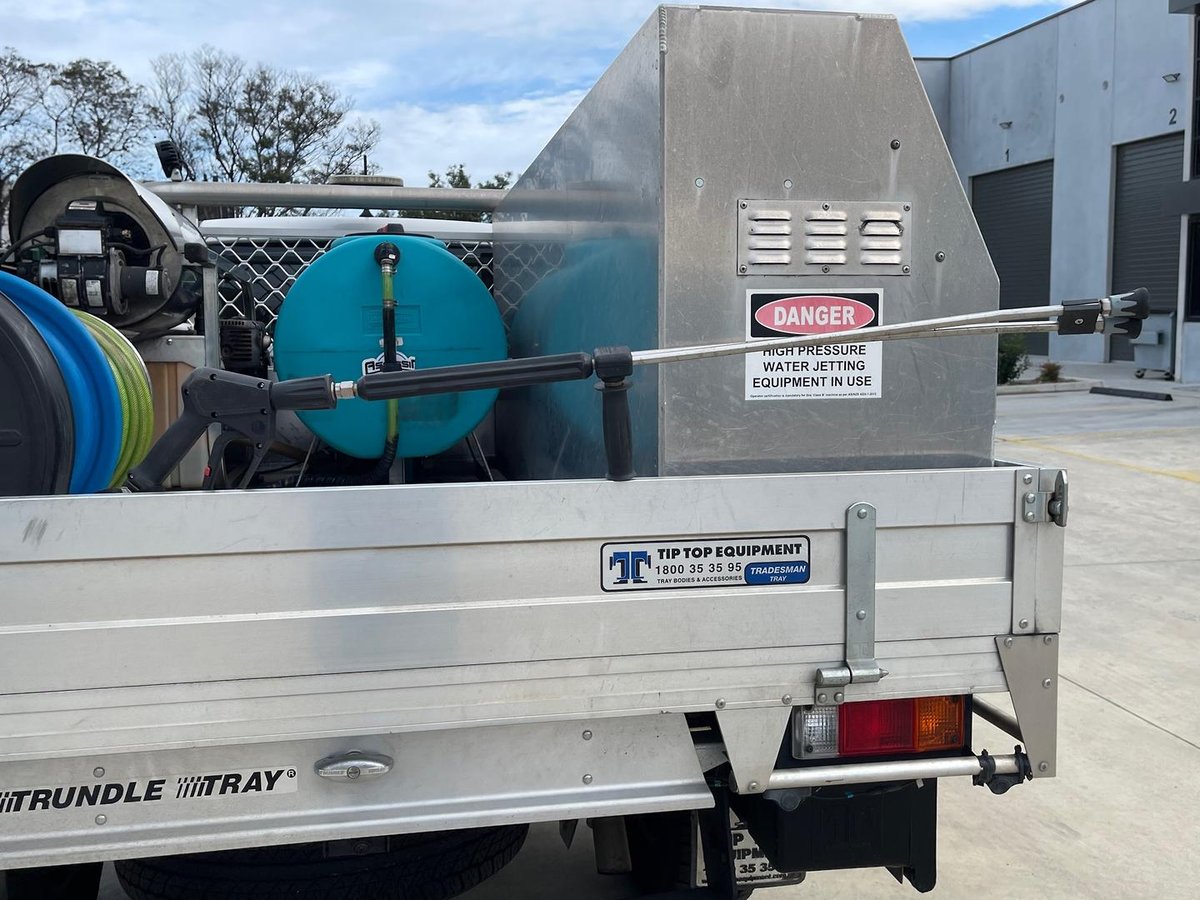 • 200L Water Tank: Heavy-duty poly tank with a secure steel frame for mobile operations.