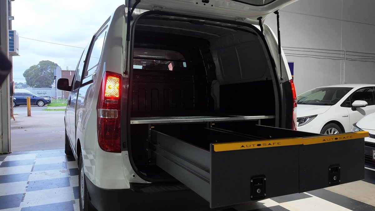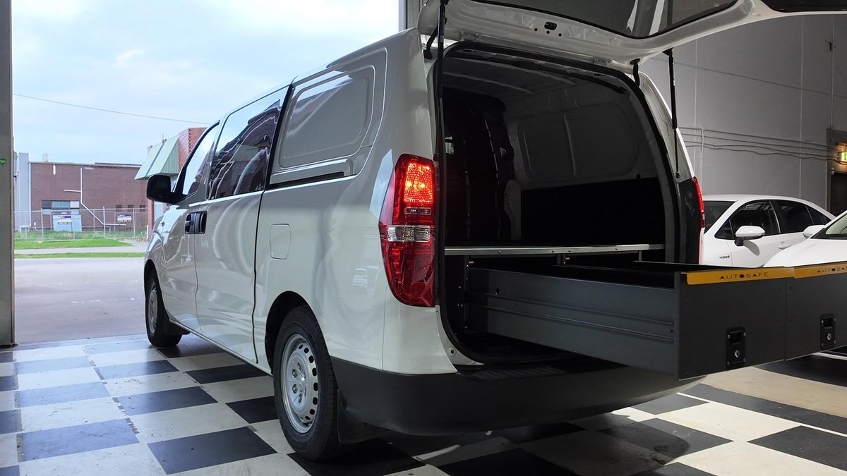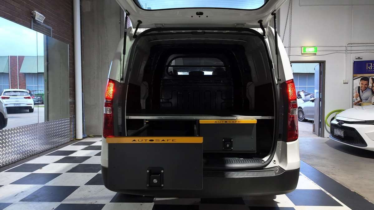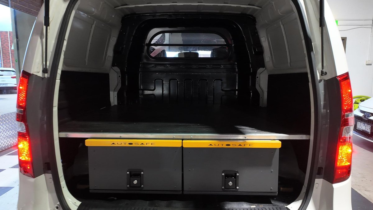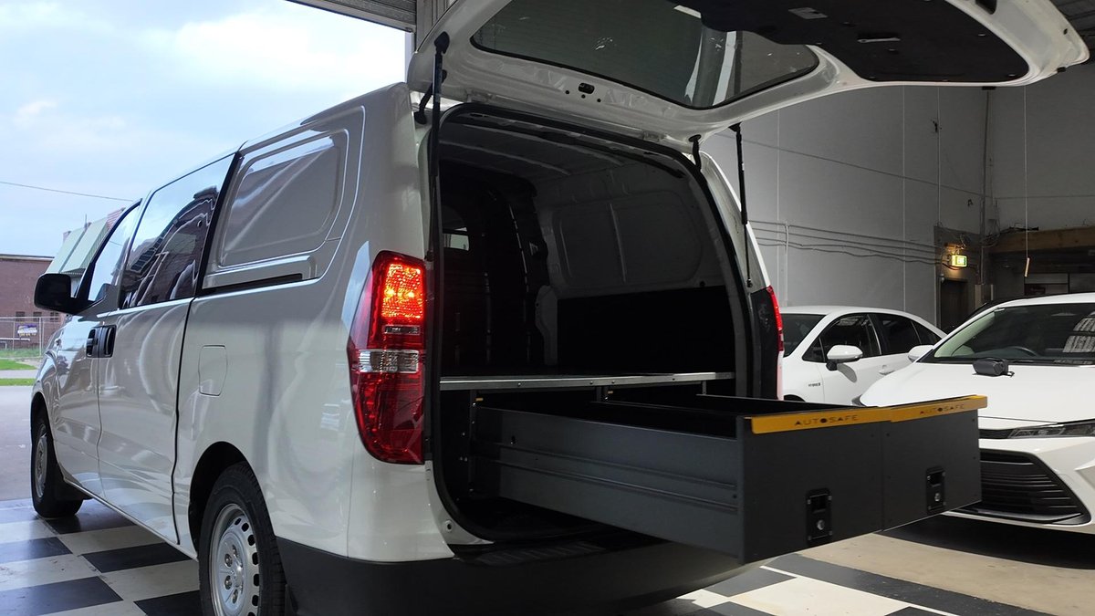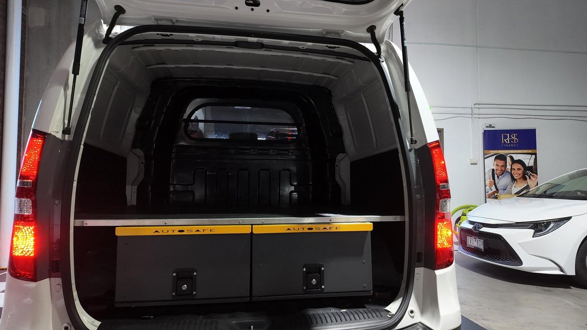 The rear cargo area has been fitted with a quality drawer storage system, providing organised storage for tools, equipment, and daily work requirements, while the cargo barrier adds safety and practicality.